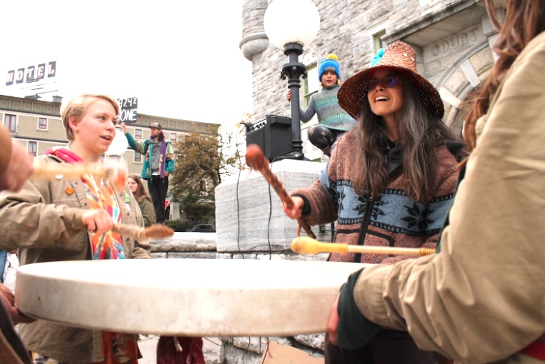 Rainbow Eyes and other visitors from Fairy Creek drummed a message of hope, power and resistance to rally on Baker Street. Local Last Stand West Kootenays folks joined in a Saturday Oct. 16 that ended up in a drumming and singing rally at the intersection of Baker and Jossephine in Nelson. We have several inspiring clips.