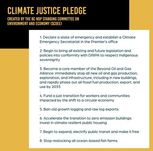 The BC NDP Standing Committee on Environment and the Economy has produced a Climate Justice Pledge that challenges much of the current governments climate and energy plans. The Committee calls for stopping all new oil and gas production including pipelines for gas in new buildings. They want a Climate Emergency Secretariat in the Premier’s Office and a fund for a just transition for workers and communities impacted by the shift from fossil fuel industries. Banning all old growth logging and raw log exports is also on their agenda.