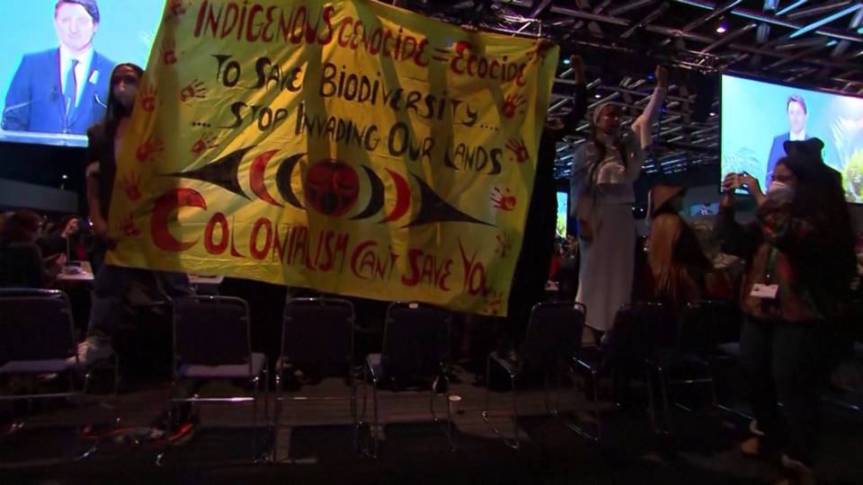 FIRST NATIONS ACTIVISTS INTERRUPT TRUDEAU AT MONTREAL CONFERENCE. STOP INVADING THEY POINT OUT.
